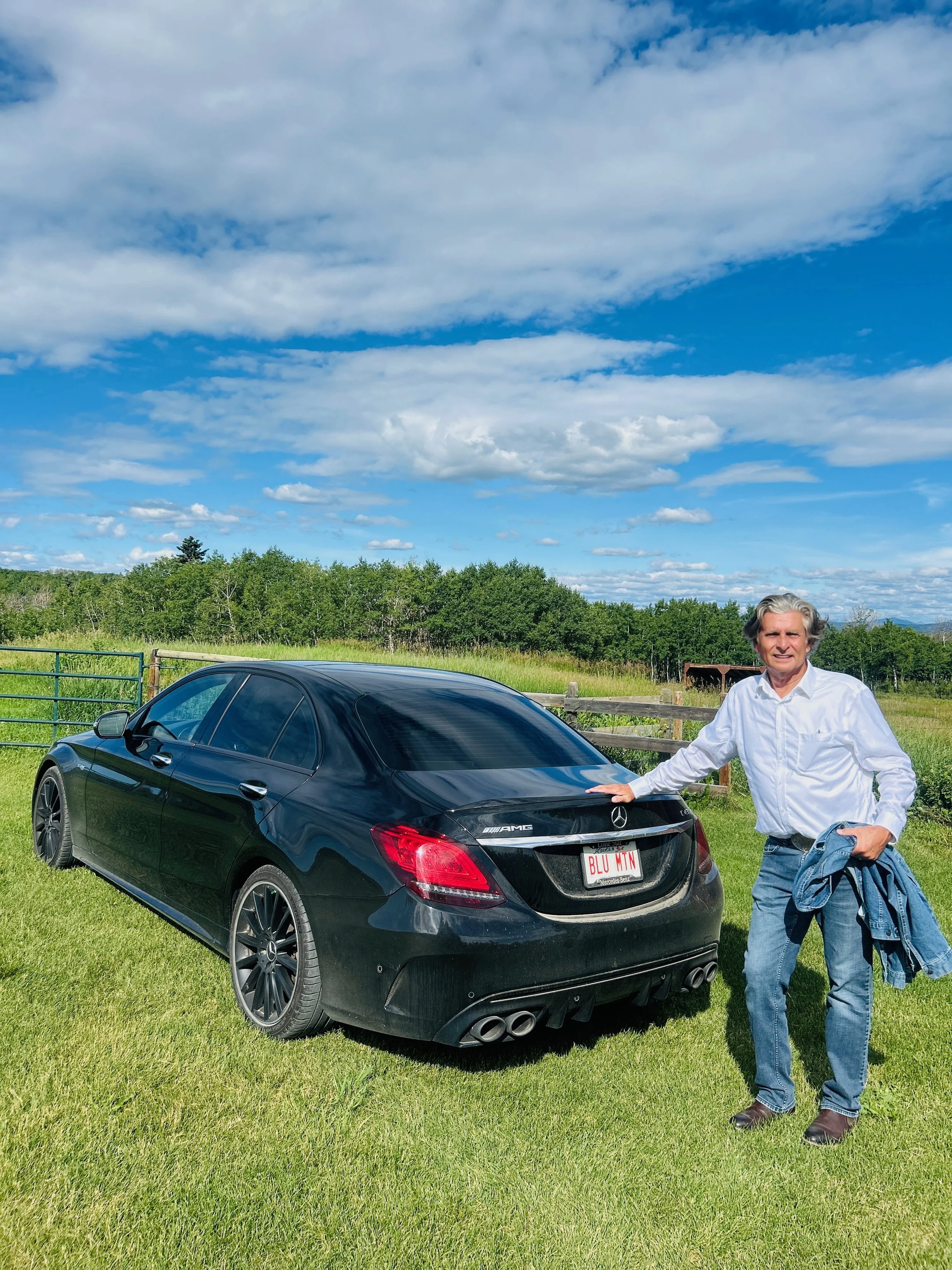 A man standing on a grassy field next to a black Mercedes-Benz AMG car under a partly cloudy blue sky.