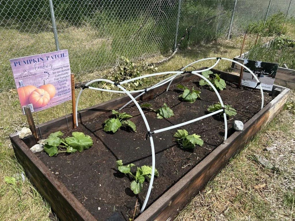 Raised garden bed with young pumpkin plants supported by white hoops and a sign reading "Pumpkin Patch" in a community garden in Foothills County.
